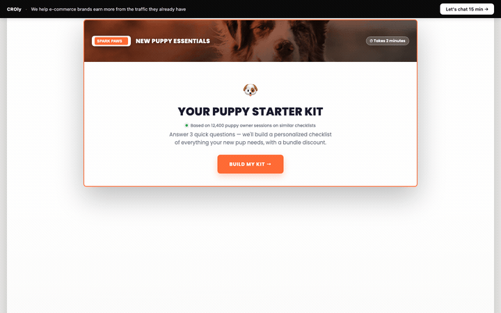 Traffic: Ahrefs — 8,400 clicks/mo on puppy blog cluster · AOV: $60 (puppy essentials bundle) · CR lift: +0.45% (Baymard blog-to-commerce checklist) · Formula: 100,800 x 0.45% x $60 = $272,000/yr